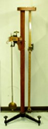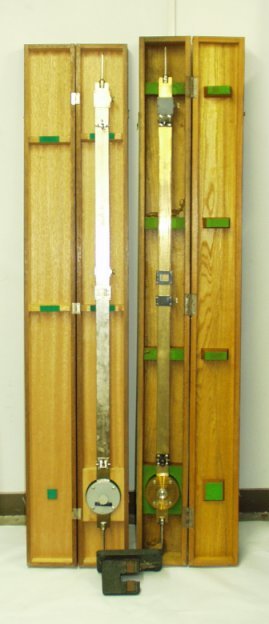 可逆振子(Reversible pendulum) 図書: 物理振子あるいはケーターの可逆振子とも言う。精密に測定された振子の長さ相当分と、周期測定からかなりの精度で重力の加速度を測定する装置。 |