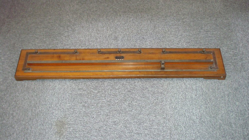 メーターブリッジ(Metre brige) 図書: 抵抗測定器。ホイートストーンブリッジの原理を用いている。抵抗線は長さ1mで、この上を移動できる接触子の位置目盛りから抵抗値を読み取る |