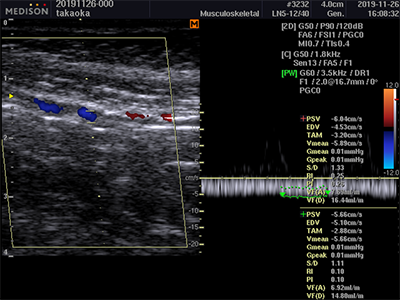医療の現場と地域企業の双方の課題を解決するために、地域企業のものづくりチームとともに新しい深部静脈血栓症予防装置を試作しました。本装置は、足関節を持続的他動運動することで、「第2の心臓」と呼ばれるふくらはぎ(ヒラメ筋)を伸縮運動させます。この時、静脈内の逆流防止弁が作用し、血流改善の効果を生みます。本装置の効果は、超音波工コー装置のカラードップラー画面により確認しました。