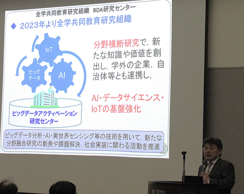 続いて、本学ビッグデータアクティベーション研究センター(BDA研究センター)の山﨑センター長より活動報告がありました。人材育成や地域創生への取り組み、学生が新たな挑戦に取り組める学習環境の整備などが紹介され、参加者からは「今後の活動を応援したい」「幅広い取り組みを理解できた」といった感想が寄せられました。