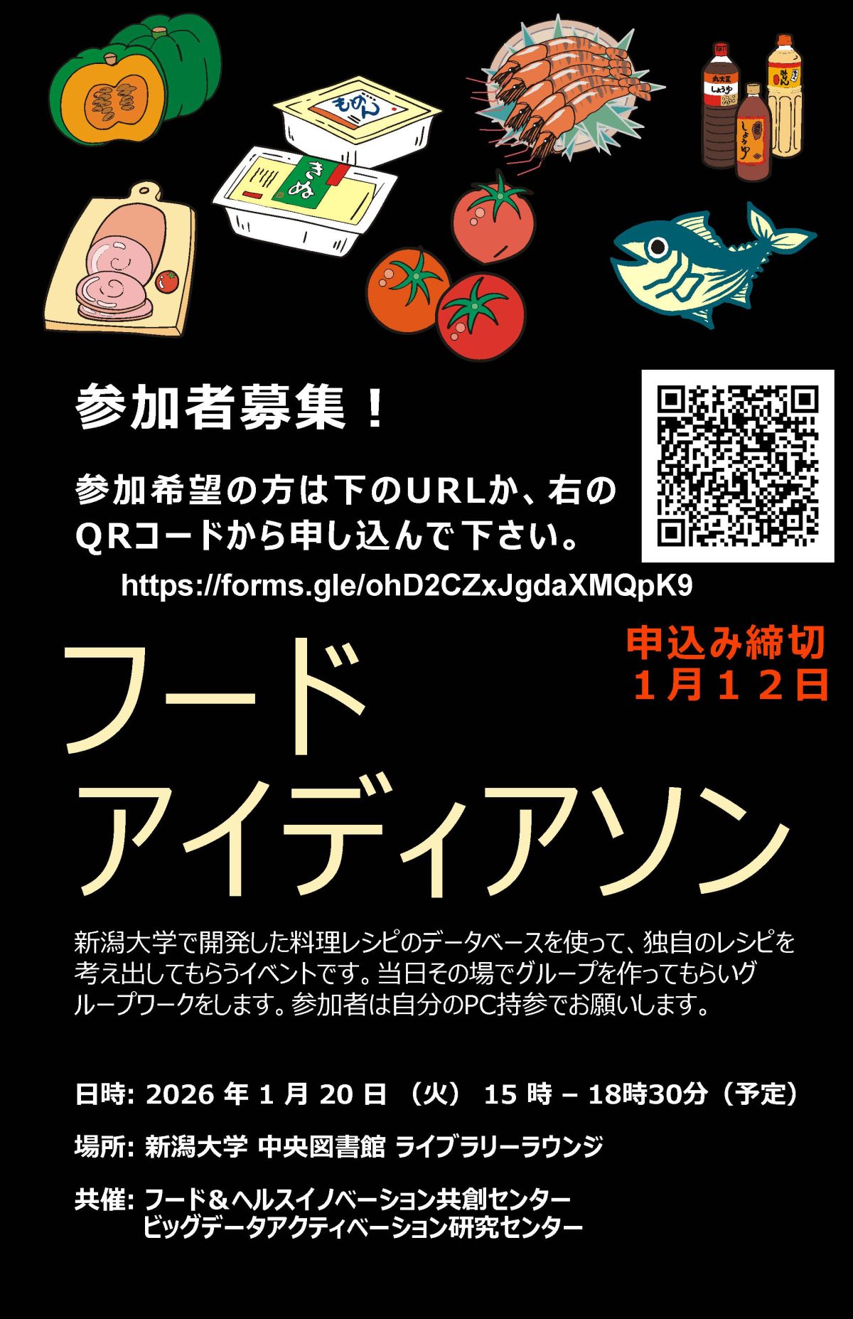 これは、新潟大学で開発した料理レシピを検索できるデータベースを使って、【独自のレシピ】を考え出してもらうイベントです。実際に料理を作るわけではないので、料理経験が少なくても大丈夫です。データベースの検索をするので、参加者は自分のPC持参でお願いします。