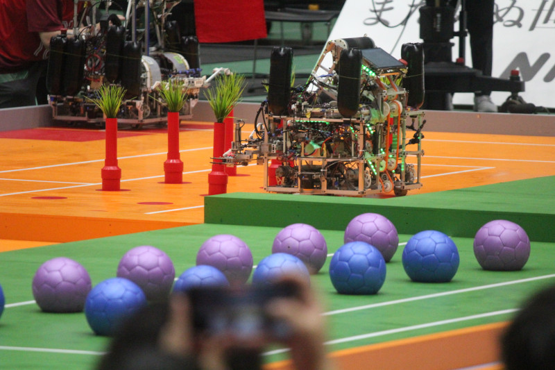続く電気通信大学との対戦では、短時間でトラブルを修正したR2も動作し、大きな点数差をつけて勝利しました。勝利したことにより、2年ぶりの決勝トーナメントに駒を進めました。