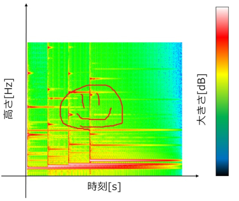 音加工アプリでは、既存の音源を読み込むことにより、横軸が時間、縦軸が周波数、色で強度を表すスペクトログラムを生成し、