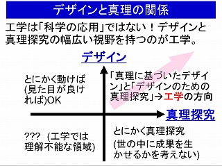 工学力センターでは、「ものづくりプロジェクト」と「スマート・ドミトリー」が実施されている。「スマート・ドミトリー」は研究活動ではあるが、テーマによっては肥料や誤嚥防止カップの開発、電気を使わない冷却法等、具体的な「もの(機能)」を目指しており、一方「ものづくり」でもトラブル解決には原因を究明する研究力が必要である。下の図は、私が総合工学概論の講義で使っている「工学とは何か」を説明するものであり、単なるものづくりや自己目的化した研究では無く、科学的真理に基づいた高度化が工学の方向性であるとしている。この科学的真理には、すでに確立した教科書的なものもある。