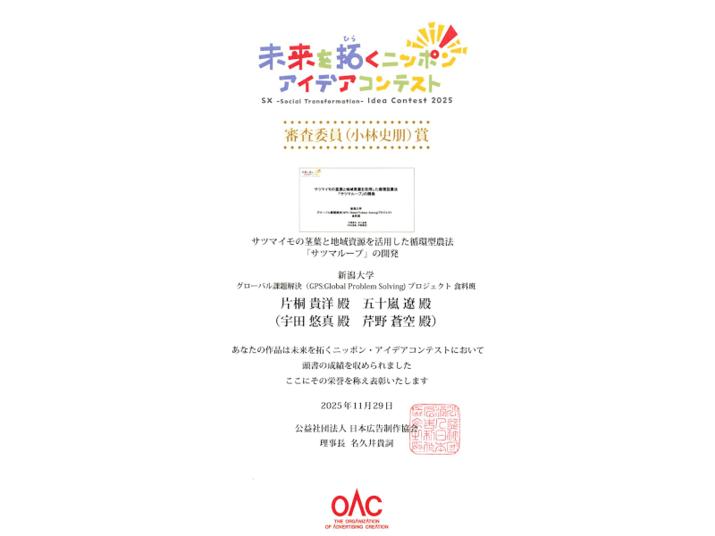 スマート・ドミトリーのグローバル課題解決プロジェクトの片桐貴弘さん(科学材料分野1年)と五十嵐遼さん(力学分野1年)が第一回「未来を拓くニッポン・アイデアコンテスト」で審査員賞を受賞しました!「未来を拓くニッポン・アイデアコンテスト」は「自ら課題を見つけ、自ら解決策を考える」をコンセプトに公益社団法人日本広告制作協会が主催するアワードです。2025年度はこれまでの形式を変え、より「自分事」化して考え、より深く解決に導くアイデアを考えてもらうという趣旨で「未来を拓くニッポン・アイデアコンテスト」として刷新されました。このアイデアコンテストに、スマドミのグローバル課題解決プロジェクト(GPS)で食料班として活動する片桐さん、五十嵐さんらの1年生チームが“サツマイモの茎葉と地域資源を活用した循環型農法「サツマループ」の開発”と題した提案を提出しました。この提案は最終選考まで残り、11月29日に開催された最終選考会でプレゼン発表を行いました。そして、全応募数84件の中から、見事、「審査委員賞」に選ばれました!
