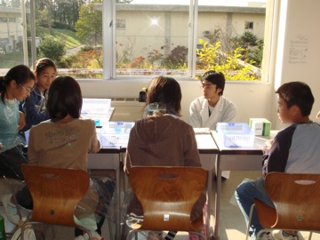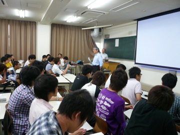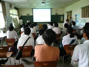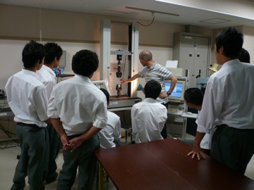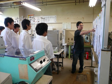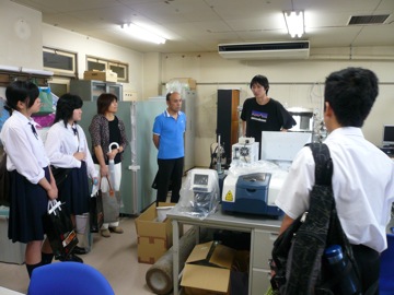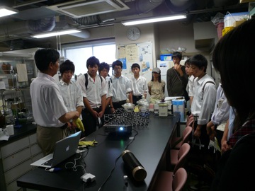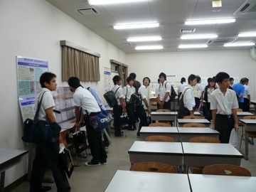 小出高校の生徒および教員の皆様(約40名)が工学部に来られました.学部に関する説明の後,3グループに分かれて電気電子工学科,化学システム工学科および本学科を見学(本学科内見学研究室:八木研究室および石橋・大木研究室)されました。