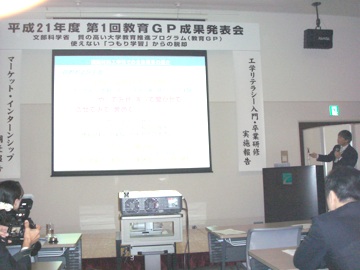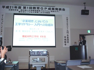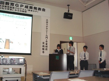 10月3日(土)13:00〜17:30にチサンホテルにて開催された平成21年度第一回教育GP成果発表会において,「工学リテラシー入門」に対する各学科の取り組みが発表されました.本学科からは,最優秀発表賞受賞グループの1年生,アドバイザーの坪井先生,およびリーダーの4年生がプレゼンテーションおよびポスターセッションに参加しました。