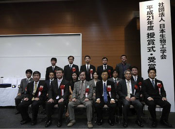 本学科谷口正之先生,田中孝明先生の研究グループが日本生物工学会より技術論文「Production of Extracellular Bifidogenic Growth Stimulator (BGS) from Propionibacterium shermanii Using a Bioreactor System with a Microfiltration Module and an On-line Controller for Lactic Acid Concentration」(Journal of Bioscience Bioengineering, Vol.105 No.3 p.184-191 (2008)に掲載)における学術的意義を認められ,平成21年度日本生物工学会論文賞を受賞されました.本論文は精密濾過膜による菌体分離と乳酸オンラインコントローラを備えたリアクターシステムを用いて,ビフィズス菌特異的増殖促進物質を効率的に生産した生物化学工学分野のテーマを取り扱ったもので,乳酸の濃度をコントローラを用いて低濃度にフードバック制御した世界で初めての研究例です.また,乳酸の時間当たりの生産性や培地使用量当たりの生産性の顕著な向上も示しており,高い工業的価値を有しています。