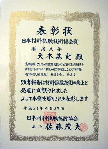本学科大木基史先生,石橋達弥先生が日本材料試験技術協会より技術論文「島津超微小ダイナミック硬度計 DUH-201S とダイヤモンド球状圧子を併用したマイクロレンジ押込み試験によるヤング率評価」(「材料試験技術」誌第53巻第2号掲載)における学術的意義を認められ,平成21年度(第22回)日本材料試験技術協会賞を受賞されました.本論文は,600台を超える普及型ナノインデンターとしての島津ダイナミック超微小硬度計DUH-201Sの広範囲な利用者にとって重要な材料特性値であるヤング率を,圧子形状補正を考慮した解析方法の導入により微小領域下において広範囲の材料に対して精度良く測定可能である事を示したものです。