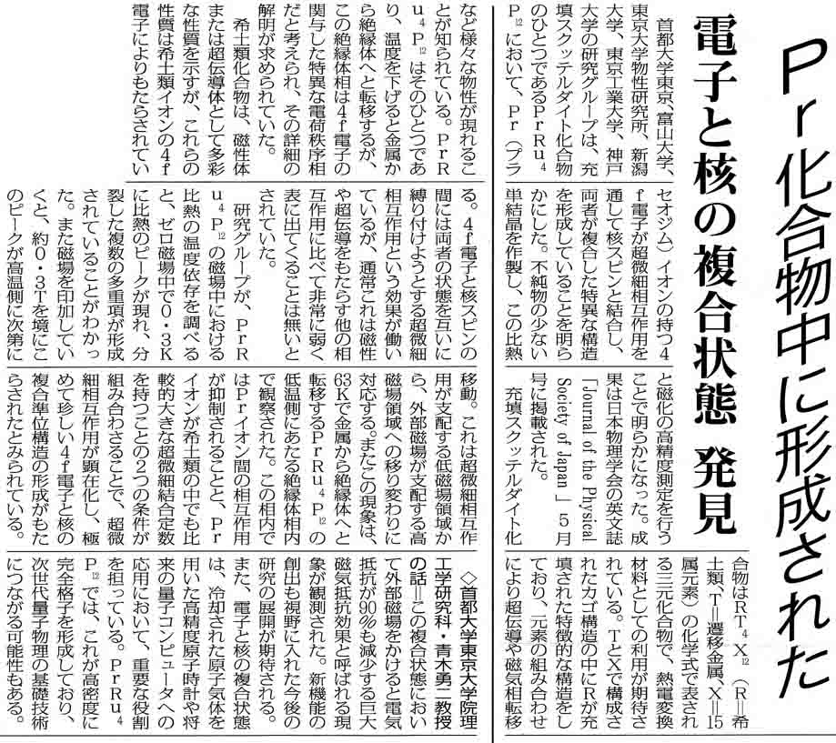 本学科椎名先生が首都大学東京,富山大,東大物性研,東工大,神戸大の研究グループと行っている共同研究において明らかにした知見が,5/20付「科学新聞」に掲載されました.この発見による新機能の創出も視野に入れた今後の研究展開が期待されます.詳細は日本物理学会英文誌「Journal of the Physical Society of Japan」5月号に掲載されています.