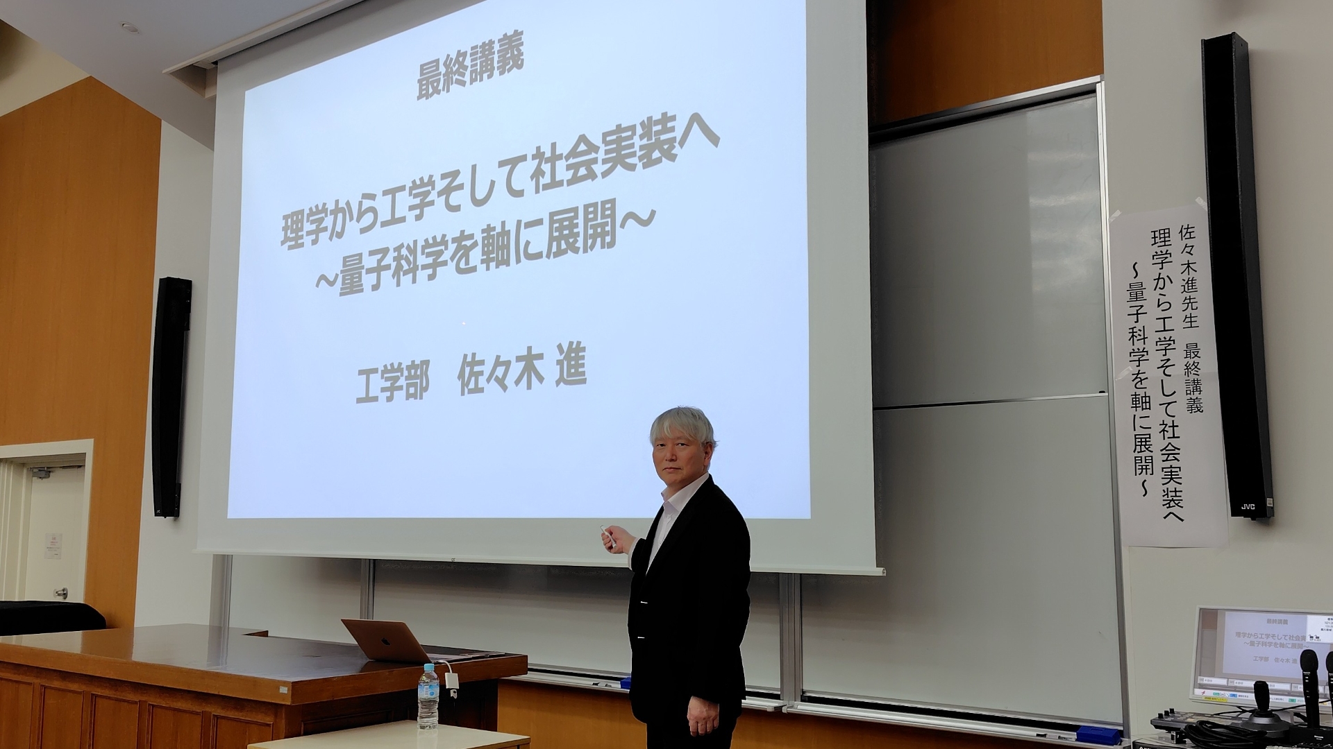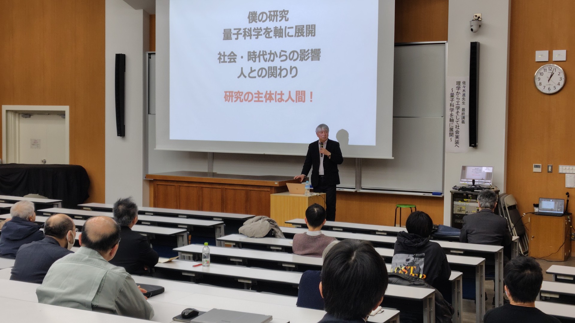 佐々木進先生の最終講義「理学から工学そして社会実装へ 〜量子科学を軸に展開〜」が行われました。工学部101講義室とオンラインで学内外の方々が多数参加されました。