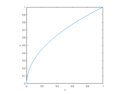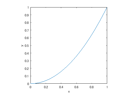 fplot(@(x) x.^2, [0 1]) xlabel('x') % 横軸のラベル ylabel('y') % 縦軸のラベル axis square % 縦横比の調整