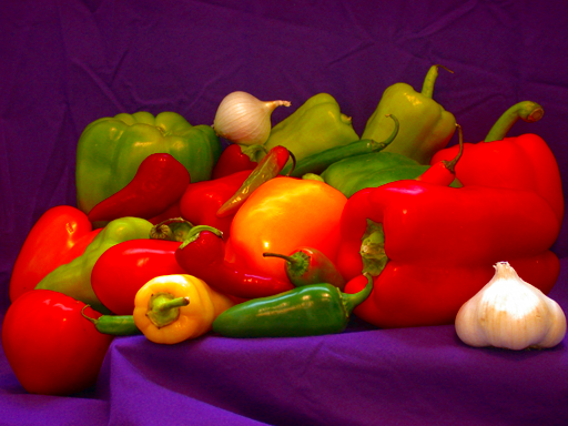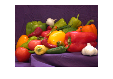 画像ファイル peppers.png の RGBカラー配列を rgb2hsv 関数で HSVカラー配列へ変換し、S 成分を2倍して hsv2rgb にてRGBカラー配列に戻し、処理結果を 画像ファイル highsatpeppers.jpg に保存せよ。