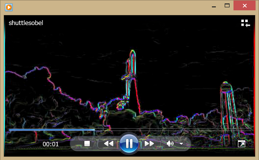 を生成し、映像データ shuttle.avi に対する以下の処理を各フレームに対して 施してみよう。 また、その処理結果をAVIファイル shuttlesobel.avi に保存しよう。