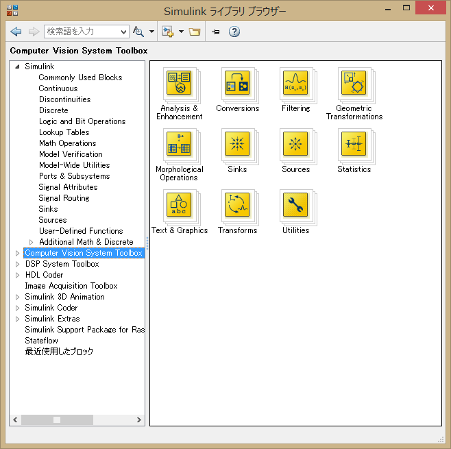 すると、ライブラリブラウザーは Computer Vision System Toolbox の ブロック群を表示する。