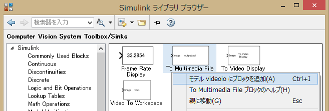 出力先として「Computer Vision System Toolbox/Sinks」内にある
