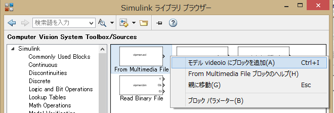 ブロック群から 「From Multimedia File」を右クリックして、 モデル videoio にブロックを追加しよう。