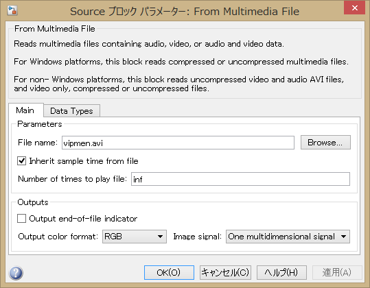 入力AVIファイルを変えたい場合には、「From Multimedia File」ブロックを ダブルクリックして、パラメータダイアログを開き、「File name」を変更する。