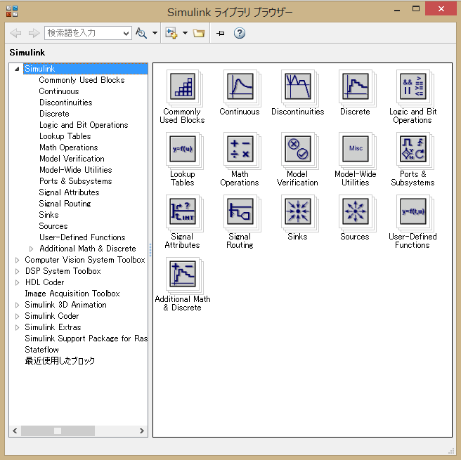 をクリックしよう。すると、以下のような Simulinkライブラリブラウザーが現れる。