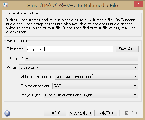 出力AVIファイルを変えたい場合には、「To Multimedia File」ブロックを ダブルクリックして、パラメータダイアログを開き、「File name」を変更する。