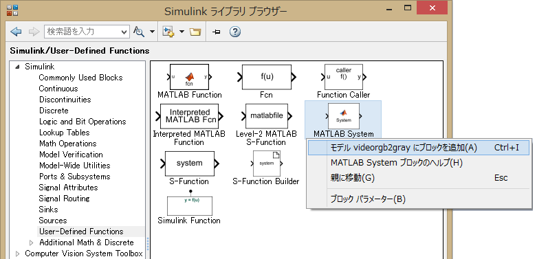 Simulink ライブラリブラウザーから「Simulink/User-Defined Functions」の ブロック群を表示し、その中から