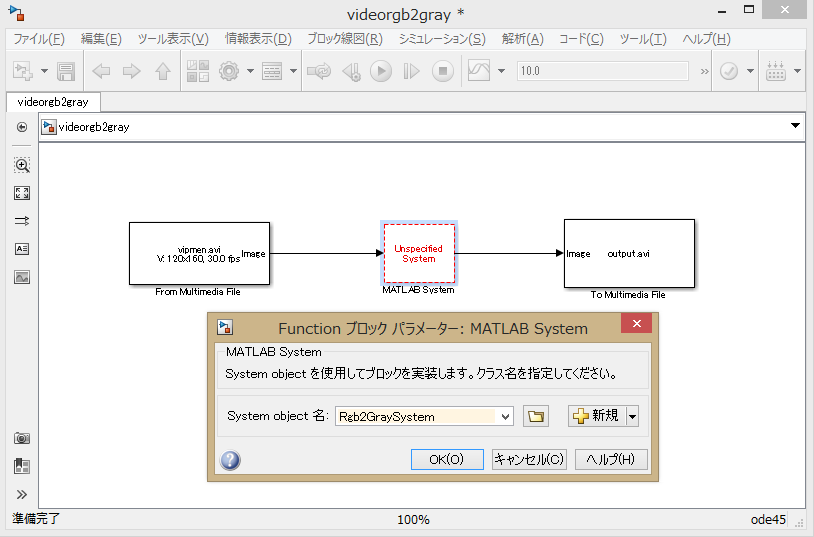 MATLAB System ブロックを映像入出力の間に挟み、プロパティダイアログを開いて