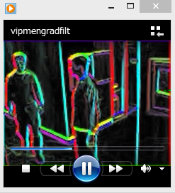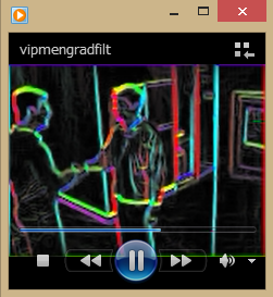 vrObj = VideoReader('vipmen.avi'); frameRate = vrObj.FrameRate; vwObj = VideoWriter('vipmengradfilt.avi'); vwObj.FrameRate = frameRate; rgsObj = Rgb2GraySystem(); hrsObj = Hsv2RgbSystem(); gfsObj = GradFiltSystem(); vwObj.open() while (vrObj.hasFrame()) frame = vrObj.readFrame(); % フレーム入力 graysc = rgsObj.step(frame); % グレースケール化 [mag,ang] = gfsObj.step(graysc); % 勾配フィルタリング ang = (ang+pi)/(2*pi); % 偏角の正規化 mag = min(mag,1); % 大きさの飽和処理 [r,g,b] = hrsObj.step(ang,mag,mag); % 疑似カラー化 frame = cat(3,r,g,b); % RGB配列結合 vwObj.writeVideo(frame); % フレーム出力 end vwObj.close()