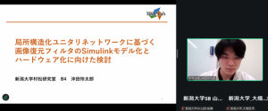 • 沖田怜太郎:局所構造化ユニタリネットワークに基づく画像復元フィルタのSimulinkモデル化とハードウェア化に向けた検討