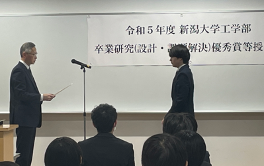 新潟大学工学部機械システム工学科で卒業研究発表会を行いました。そこで本研究室に所属している磯島 匠くんが優秀賞を受賞しました。