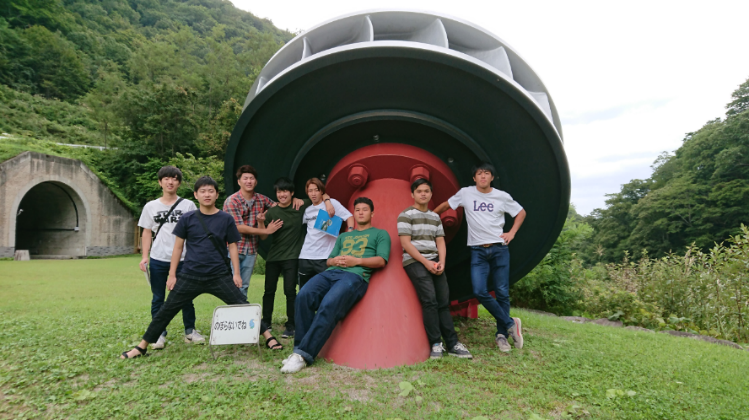 ゼミ旅行で奥清津揚水式発電所(湯沢)を見学しました。フランシス水車の前で記念撮影