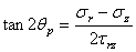 この方程式を満たすθsは2つの値がある。θsとθs+90°はτmaxとτminに対応する。角度θsはθpに45°である。