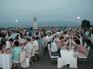| 3. 懇親会 理事会・総会が予想以上に長引いて予定を40分ほどオーバーしてしまったためスタッフは大いにあわてましたが、何とか懇親会を予定通りに始めることができました。これは当日晴天に恵まれたことと並んで奇跡的なことといわざるを得ないと今でも思っています。 |